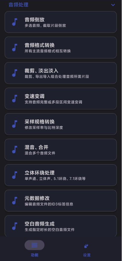 音频倒放、格式转换、裁剪、变速、立体环绕、修改元数据。
